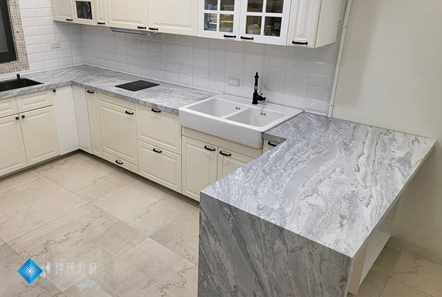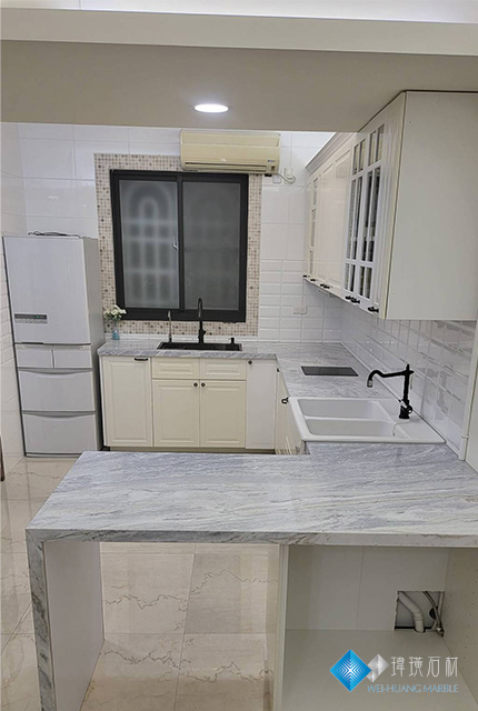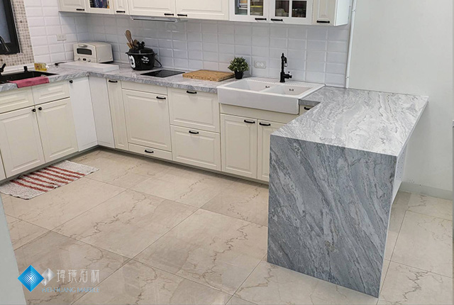 選用冰川藍打造的流理檯以及中島檯,別緻質感,打造出明亮舒適的下廚空間